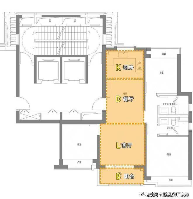 户型内部设计整体非常方正,KDLB一体化设计,形成超尺度公共社交场域,南北通透。