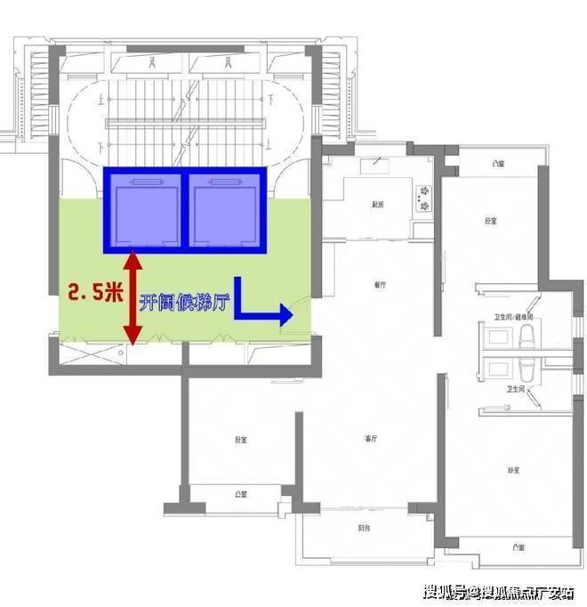 虹口源·717的140平户型的候梯厅短边净宽约2.5米,大幅超出规范标准,使用感受相当舒适。