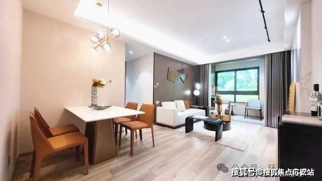 2、客厅与餐厅连为一体,约4.8米大面宽设计,外连观景阳台,拥揽四季的人生景致。