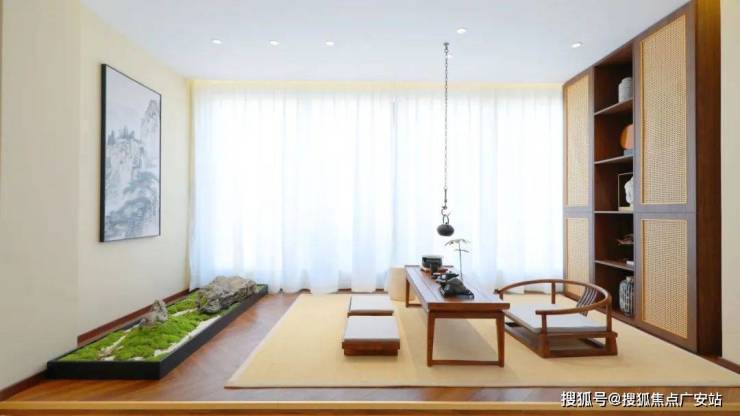 茶室是这个样板间的一大亮点,也是宋氏美学风格的集中体现。木质的地板让整体感受温润舒适,墙面局部挂着书法作品,为茶室增添了浓厚的文化氛围。