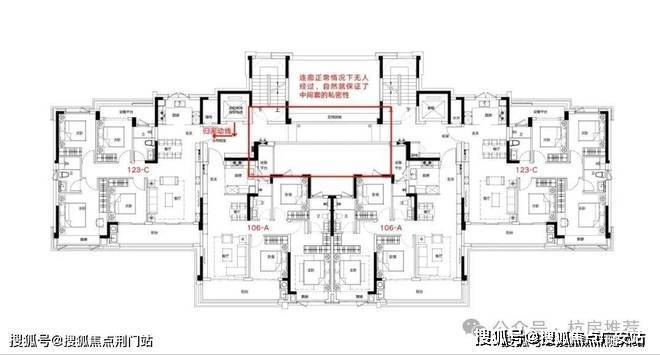 首先这个户型解决了中间套的隐私问题,如上图所示,两个边套回家都不需要经过连廊,所以保证了中间套的私密性。