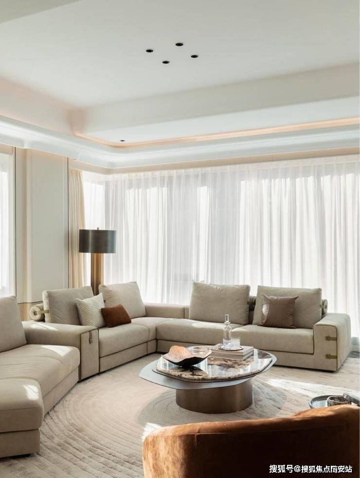 建面约325㎡孟也作品,则以线条柔化空间边界,新艺术护墙板与石材组合演绎材质美学。