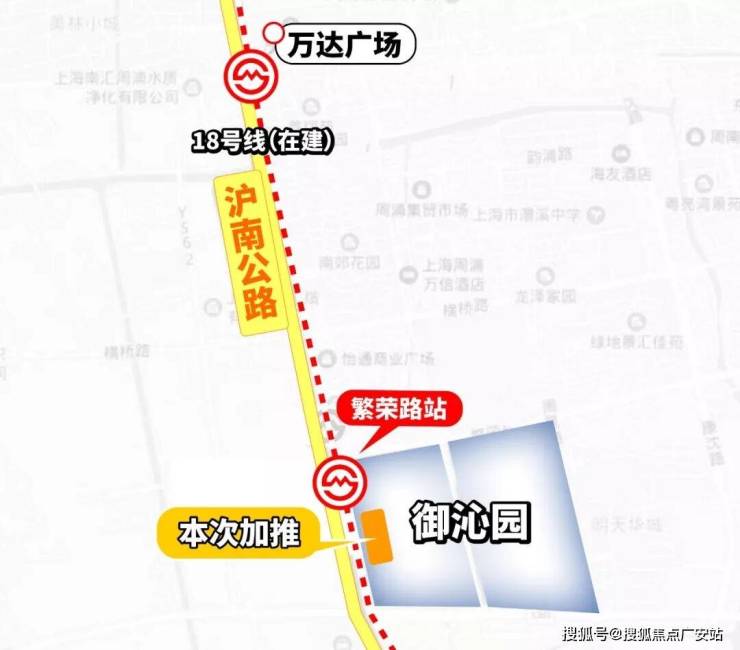 项目距离轨交18号线繁荣路站仅约200米,步行3分钟可达,7站直达龙阳路换乘2/7/16号线;自驾方面,沿沪南公路可快速接入外环、中环高架。商业配套上,1公里内有周浦万达广场、小上海步行街、绿地缤纷广场等,项目东侧还有明天华城自带约5000㎡商业。