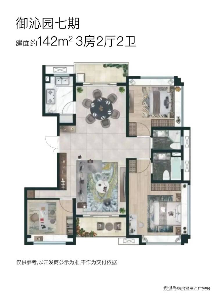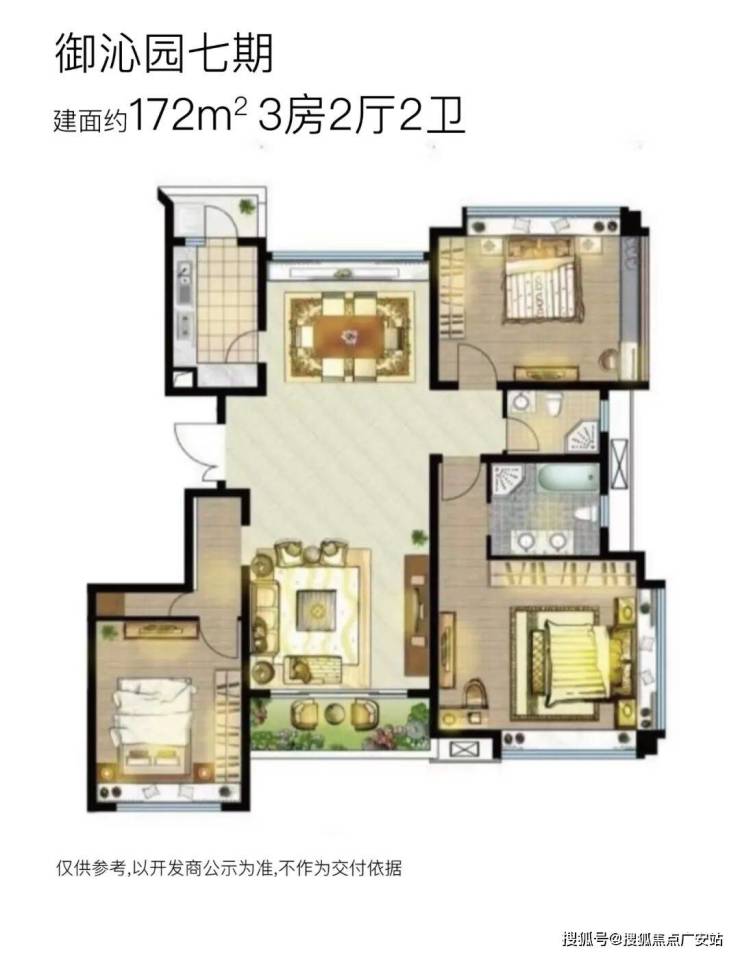 【御沁园】七期将推出3栋18F高层住宅,两梯两户无连廊设计;将推建面约132~172㎡三房户型,其中: