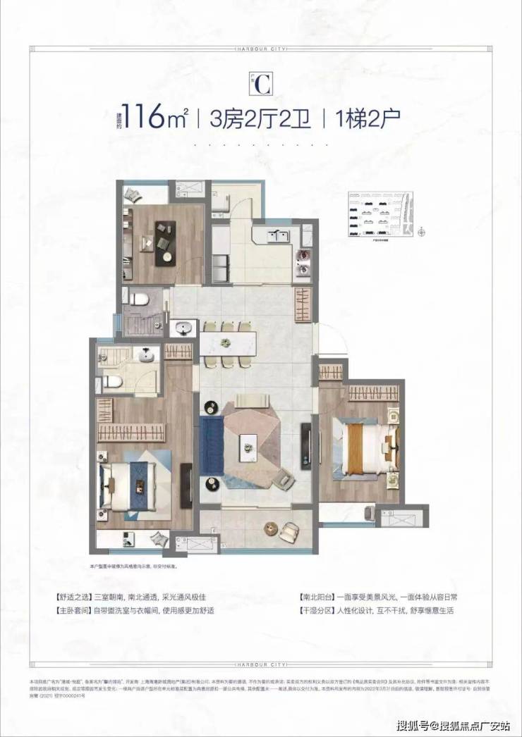 建面约92㎡、116㎡3房2厅2卫户型,这两个户型布局非常相似,都做了三开间朝南+全卧室带飘窗+南北通透+主卧套房设计+卫生间干湿分离,都是3房户型中的翘楚。