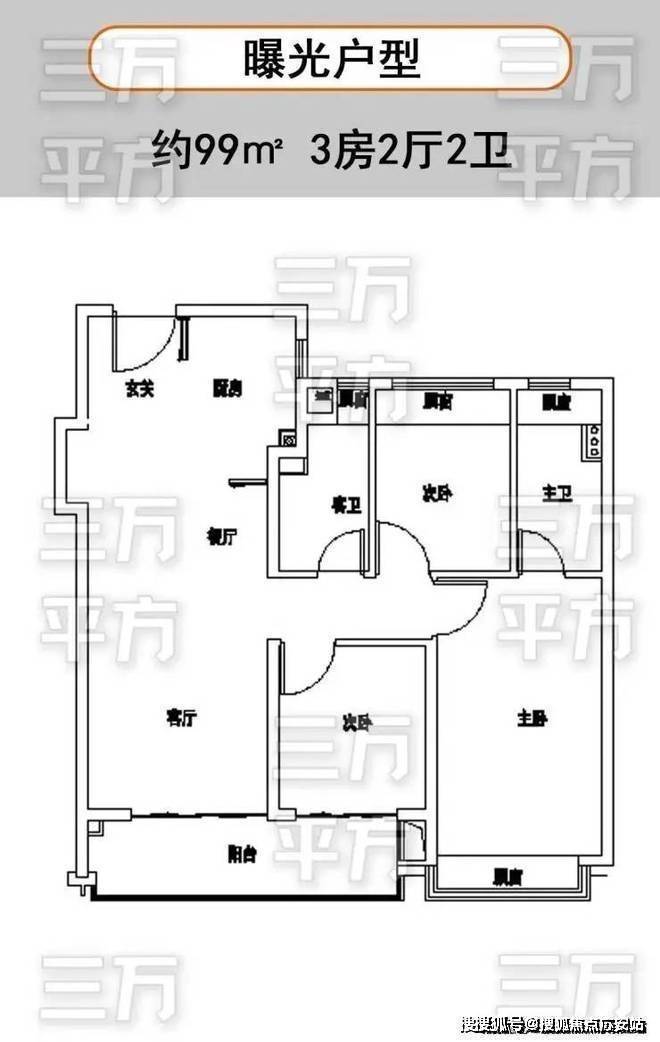 3房2厅2卫,入户侧玄关,南向3开间。