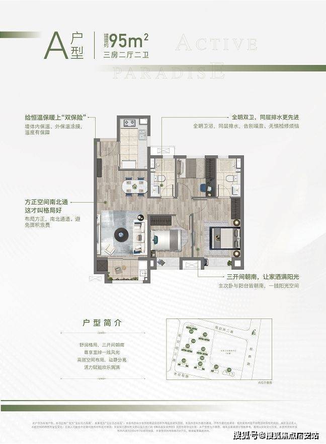 1、约95㎡的三房,南北通透,全明设计,三开间朝南,户型方正。