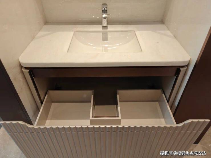 卫生间洗手台和柜体完美切割圆弧线,抽屉和水管贴合的地方贴心的做了凹槽,这既是对审美一致的苛求,也贴心考量安全性。