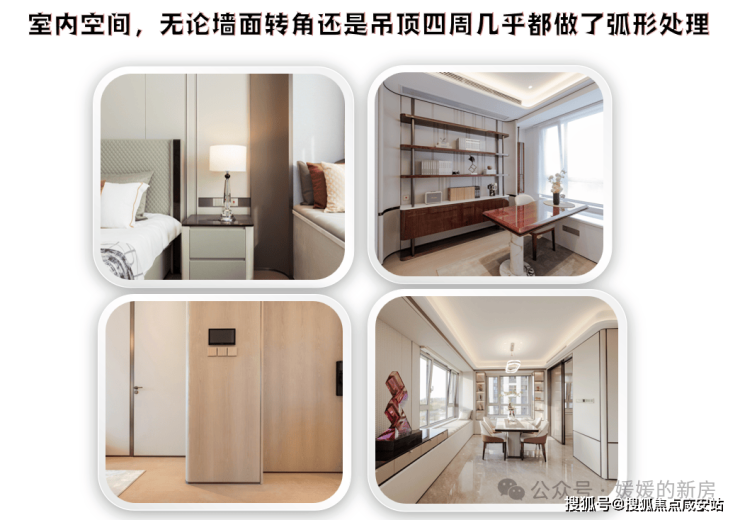 再比如室内,更是夸张,无论墙面转角还是吊顶四周几乎都做了弧形处理,不仅视觉上更显柔和,也更能达到现代轻奢与雅典温润的平衡。