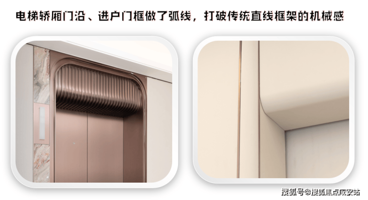 比如,电梯轿厢门沿、进户门框也皆以流畅弧线勾勒,打破传统直线框架的机械感,赋予空间流动性与艺术张力,业主日常等电梯和归家更具有仪式感。