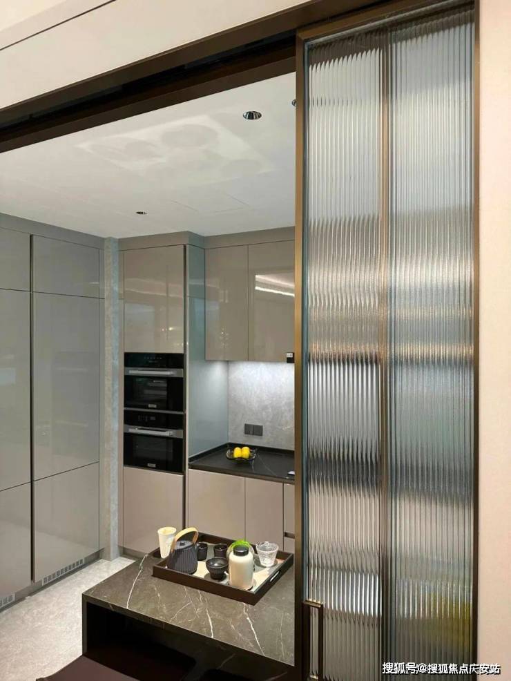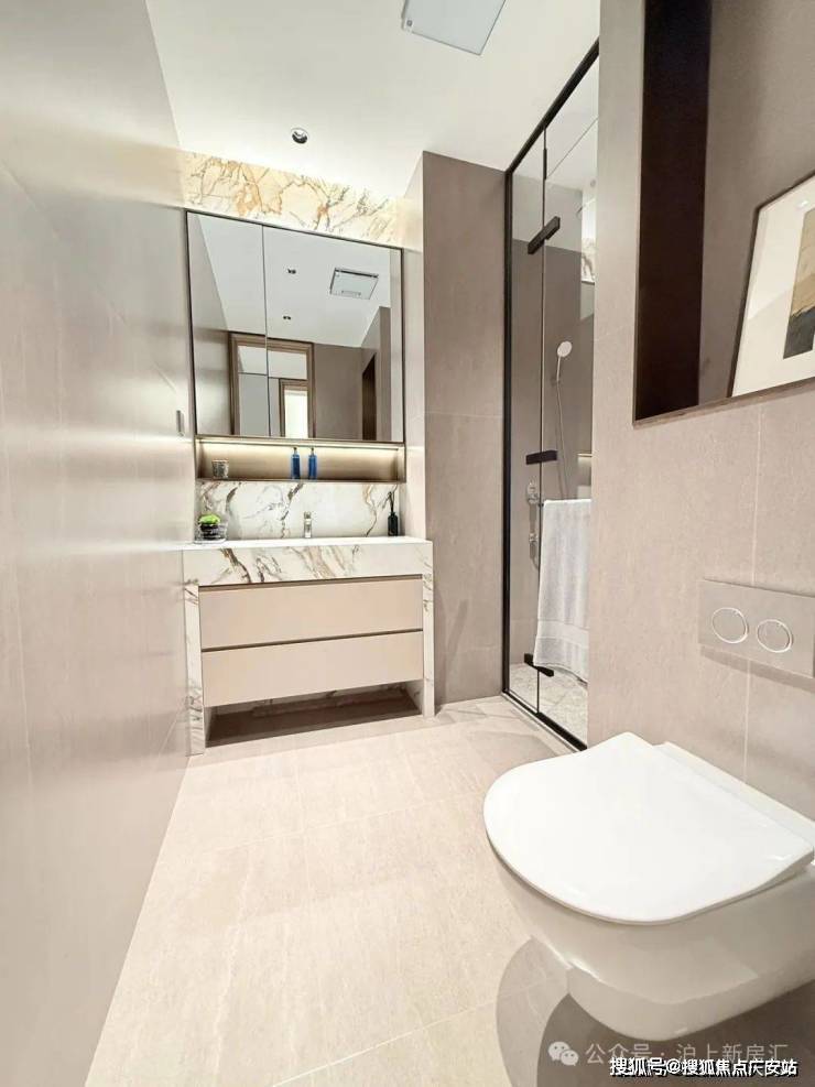 这个是入户玄关处的地面,大理石地面搭配金属线条勾勒出玄关地界,归家的氛围感从这个区域就开始了~这还不是重点,玄关座椅背后,是一面皮革包裹的墙面。鞋柜下方做了悬浮处理,同样也是内嵌灯带,这里灯光的角度还会再调整,因为灯光映射在大理石地面上,要显得尽量柔和不刺眼;同时,鞋柜下方可放拖鞋,还能放扫地机器人,便于日常清扫打理。鞋柜的饰面,纹路方向统一,呈现出极强的协调感。橱柜作为强功能性的收纳系统,自然少不了操作性能上的考究,吊柜做了升降式的拉篮,以后再也不用爬上高凳拿取了。下方的橱柜则做了转角拉篮,充分利用转角空间,使物品井然有序的同时,轻松方便取放。水槽也是一个大单槽,放得下炒锅汤锅这种大物件~抽拉式龙头,清洗大水槽的时候很方便,360度旋转伸展自如,这款弯管还是硅胶材质,柔软耐用有弹性,还可切换出水模式,出来的水柱也是很柔和细腻不飞溅。厨房玻璃门是上轨道移门,意味着地面部分没有任何轨道,不会有灰尘积攒,炒菜时关上,避免油烟散入室内;平时拉开,可以扩充室内视觉感受。卫浴缦云上海所有户型的所有卫生间里都用了悬浮式的洁具和柜体,确保了下方空间的打扫无死角,对未来的入住带来非常大的便利性!吉博力同层排水技术,静音是最大亮点;特制“水母”地漏,多重防臭防反溢。干净舒适的卫生间,是从空气到水流的全面把控~你们可以看下缦云上海是如何处理卫生间木门的防潮的——卫生间一侧用大理石做踢脚线,这是真正细致入微的巧思!主卧卫生间配备的电热毛巾架简直就是遇到潮冷节气的“福音”,让毛巾、内衣都能够提前加热干燥。层高对于缦云上海的纯大宅社区定位,能买这样产品的购房者会非常在意空间感。缦云上海全部户型层高约3.3米,室内所有空间的门都做了通顶设计,更阔绰的居室空间,将生活格局有效放大,通风、采光和观景体验的全方位提升!弧形元素缦云上海样板间里随处可见柔和的圆弧修饰,特别是柜体、墙体包边的圆弧转角,在进出各个空间时,减少磕碰的风险,对于有孩子和老人的家庭来说,是非常实用的友好设计。而且,门套做了弧形设计后,还叠加了金属线与墙纸做了分割,加强隔断界限感,提升室内家居精致度~比起中规中矩的直线,弧形施工工艺更复杂、造价更高,却多了几分灵动轻盈!这种弧形的元素不只是在样板间里,在售楼处也能经常看到,比如电梯厅。