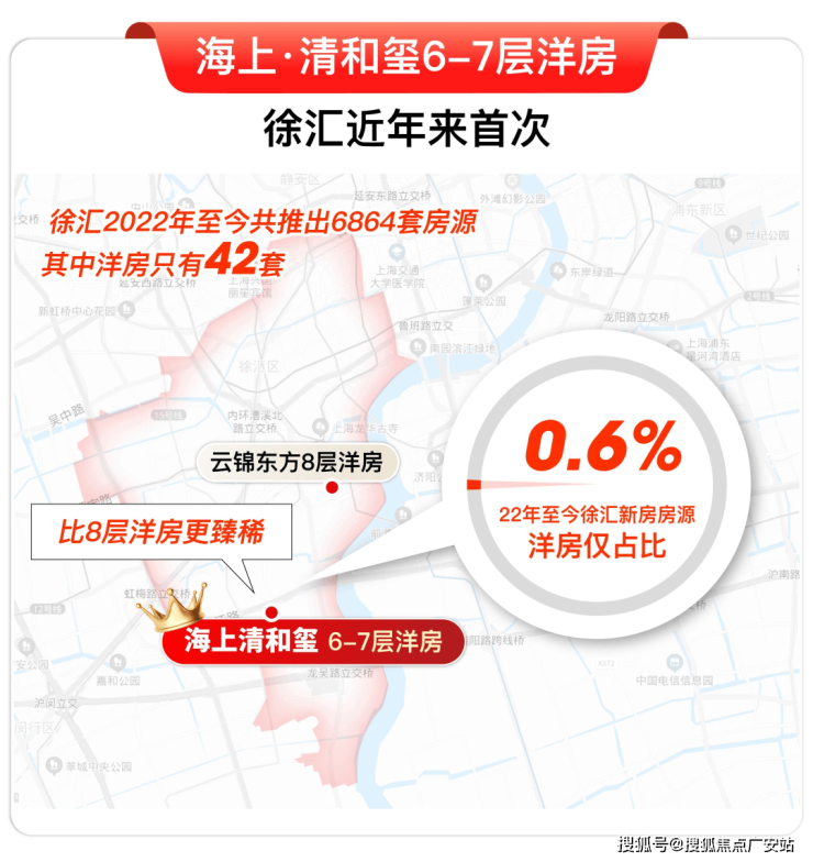✔徐汇断层式稀缺:徐汇虽楼市火爆,但洋房供应几乎真空。2022年至今上市6864套新房,其中只有42套8层洋房(来源云锦东方),再往前追溯是2020年尚汇豪庭开了144套8层洋房。换言之,徐汇5年来洋房供应不足200套,6-7层洋房,海上·清和玺更是独此一家!称这两栋洋房为徐汇 “楼王”,实至名归。