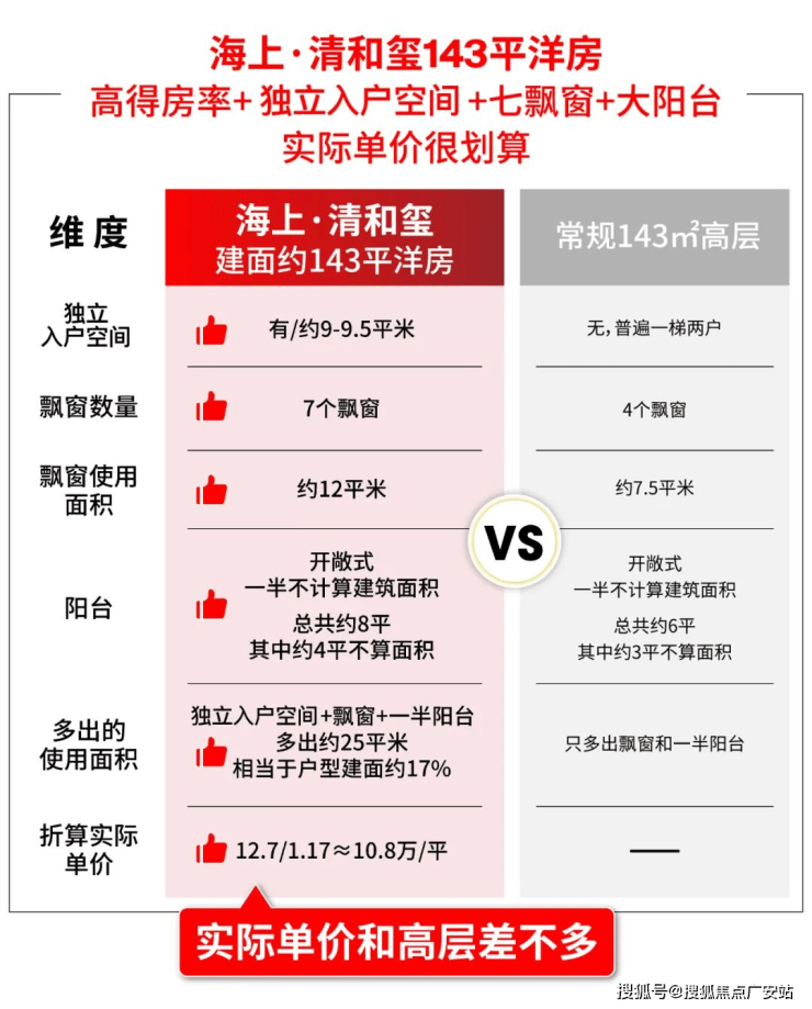 ✔标准层层高约3.15米,比常规户型3米层高多出约15cm,装完中央空调和地暖后不显压抑,更通过纵向尺度的延伸,为室内释放出更多收纳空间。值得一提,相比高层,洋房本就得房率高,海上·清和玺更是凭借“独立入户空间+七飘窗+大阳台”,实得率拉满!简单估算一下,多出约25㎡使用面积,相当于多了约17%的建面,折算下来单价约10.8万/㎡!这也是为什么我看到均价后说“惊喜”的一大原因。
