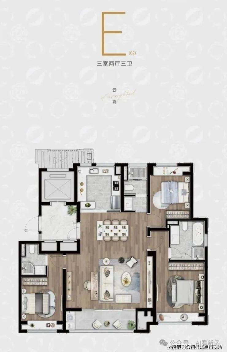 E户型:建面约140㎡3房2厅3卫▼