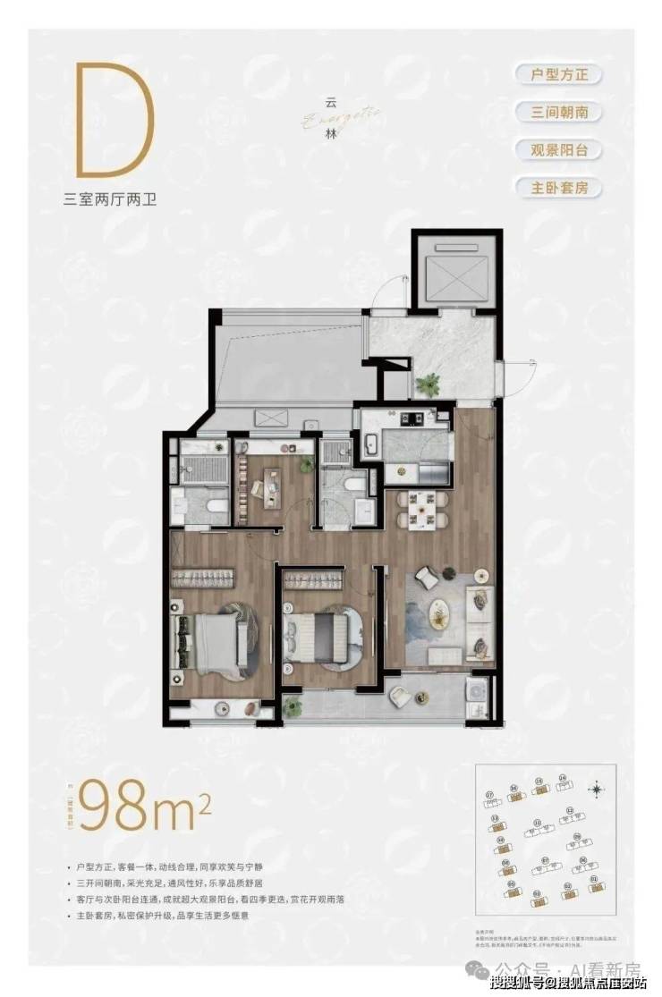 约98㎡3房2卫户型,三开间朝南,并且这贯穿客厅+次卧的超大阳台实在是惹眼,这个南向的视野延展度以及采光度相比同级别的户型来说,要更加出色。