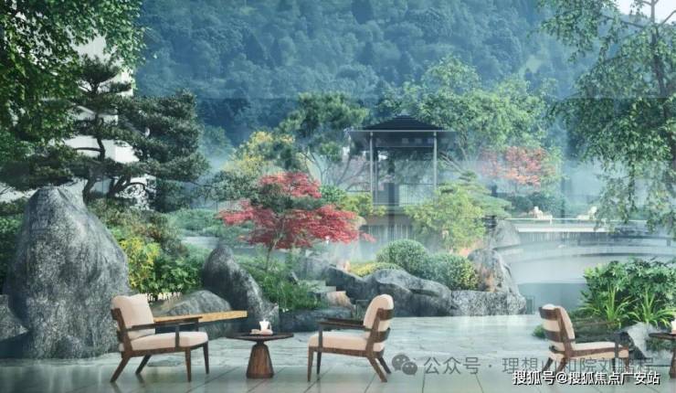 社区依临平山脉走势,整体北高南低。景观中轴结合宋画中的巨瀑、山石、花木、溪流、花池,抬地地形营造出淡然内敛的游园体验。