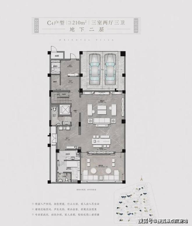 在建筑空间设计上,富春御园实现了传统院墅的现代革新。项目采用两层地面+地下室的创新布局,以170-320㎡的灵动尺度,打造出户户带庭院的中式合院。建面约320㎡的隐世合院以江南古镇为原型,约一亩地的家庭院落内亭轩错落、假山流水,目之所及尺度奢阔;而210㎡舒居合院则以约12m的南向开间,升级了人居体验感。这种既保留东方隐逸情怀,又融入西方享乐主义的设计哲学,使富春御园成为当代名仕的"第一居所"