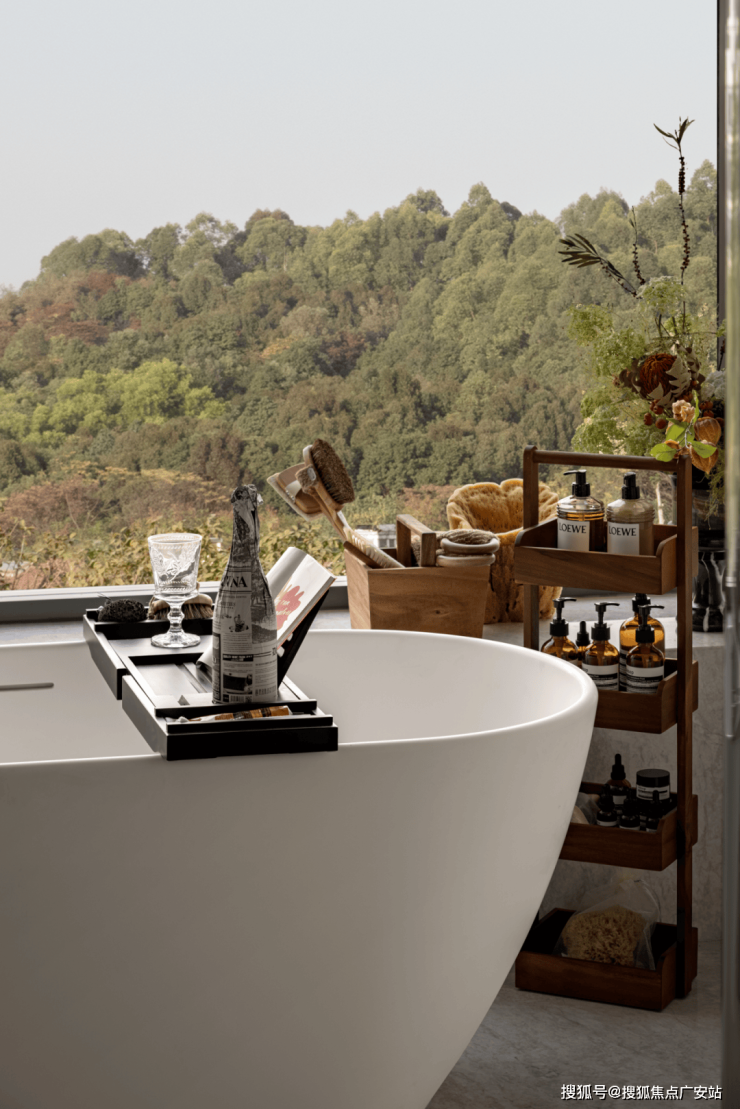 浴室紧邻一片落地窗,设计师把这里彻彻底底地放在自然中,沉浮于山野之间,看似在“敞开”,实则以另一种角度尊重私密感与浪漫情调。