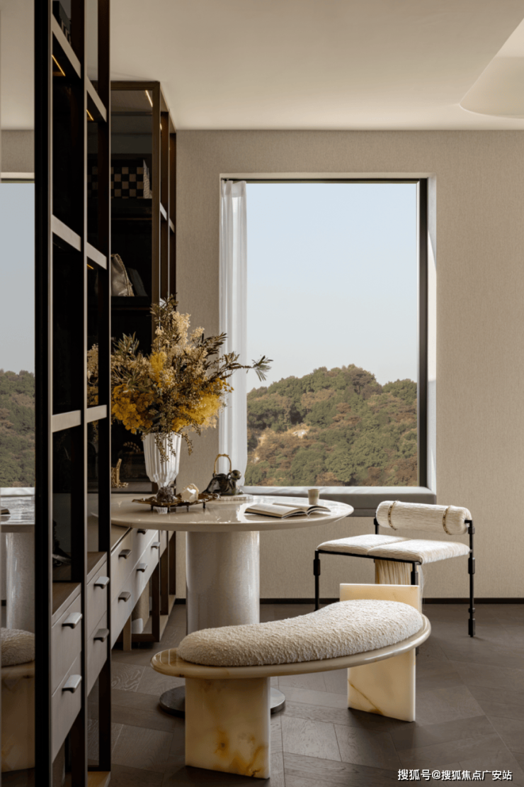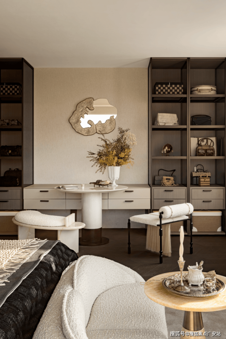在布局上,家具之间形成松弛随性的排布,随时“邀请人们”静驻而坐,梳妆台未必是紧贴墙面的规整堆砌,正如这般,在背景柜前的一桌二椅,闲适之态便可托举体验。