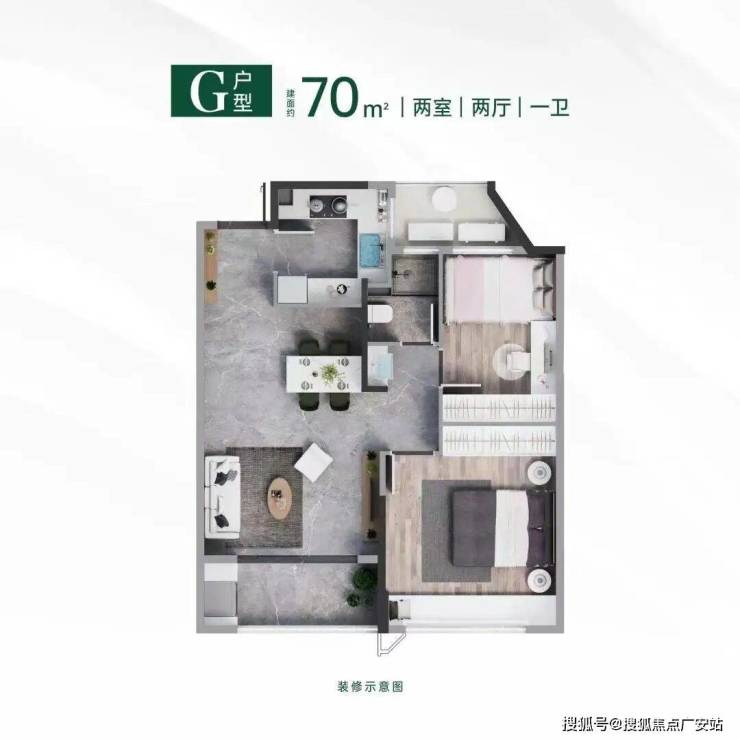 约70㎡户型通过园区景观配套、户型细节设计等铺陈轻奢生活质感,完美演绎极致小户型也能拥享豪宅的精致生活氛围。
