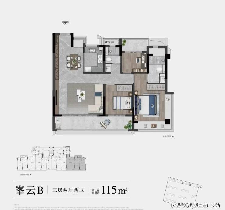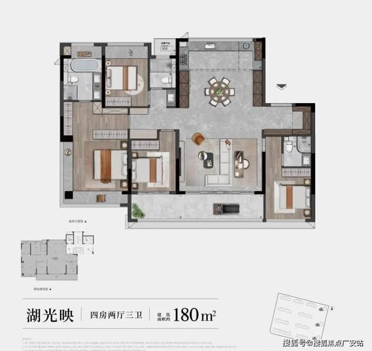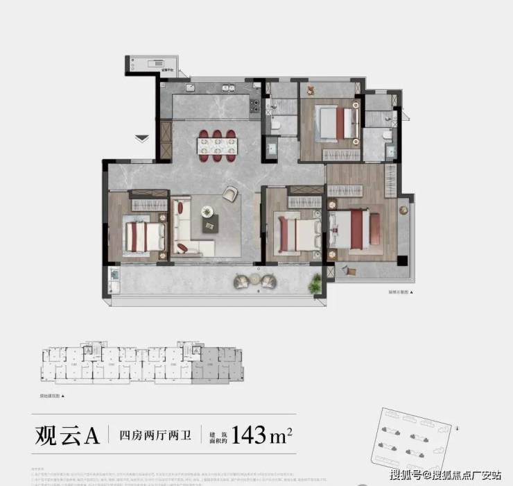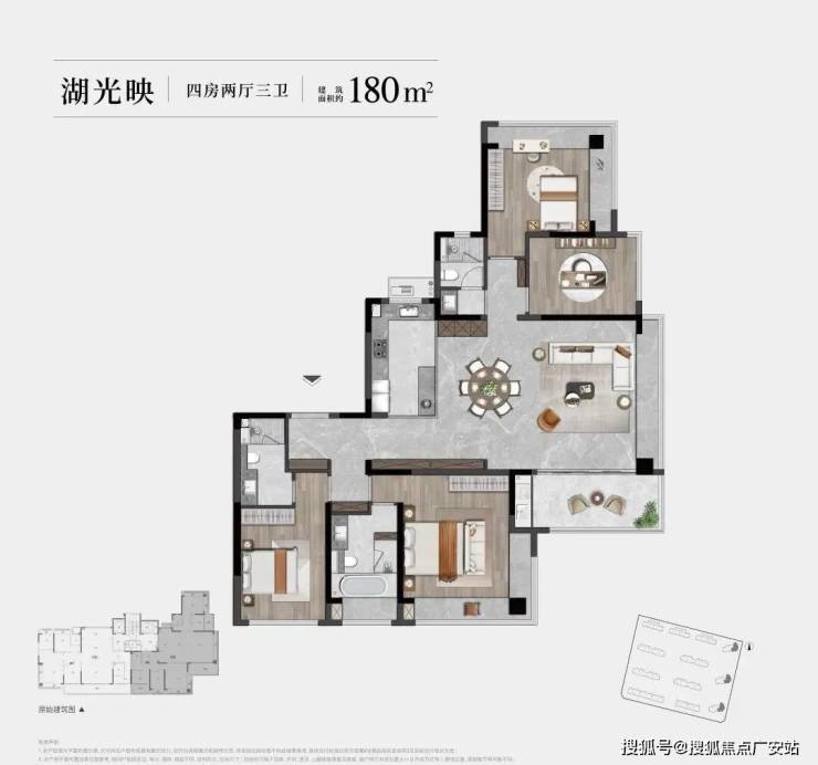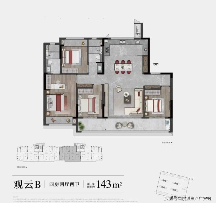 四房三套房设计,四开间朝南,约16.3米面宽,采光、视野极佳;
