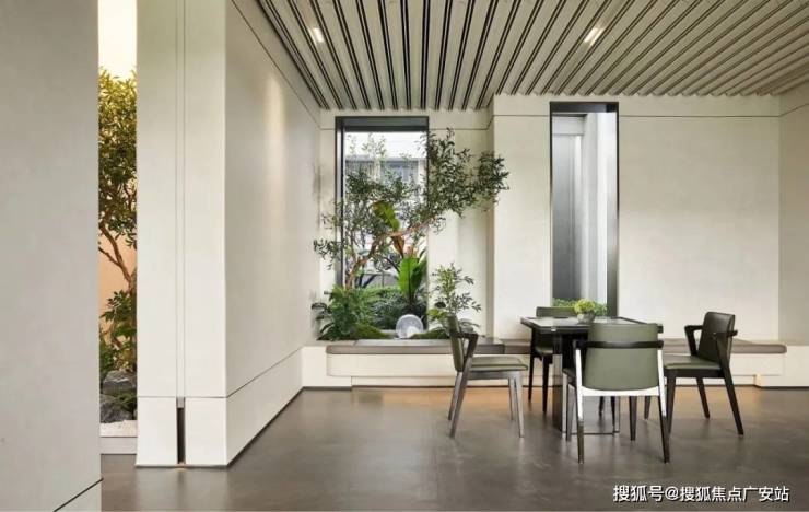用料上,庭院两侧设计师选用大理石与镂空铝板虚实结合,利用2层柏翠造型铝线条错拼而成,更显精致;