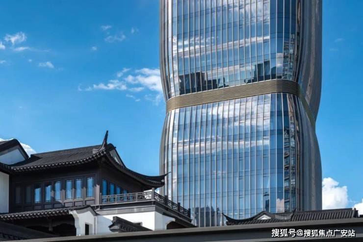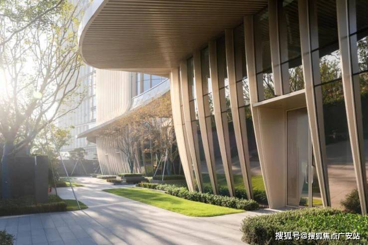独特的古铜色建筑立面在建筑群中脱颖而出,铝板与玻璃的双材质交叠,使得立面在不同的光线角度下产生丰富的视觉变化,极似莲池“水韵”。通过抽象凝练水波纹路,将自然融入建筑,塑造出典雅现代的办公及商业形象。