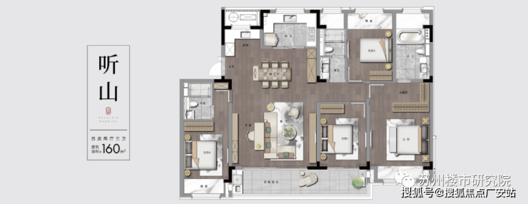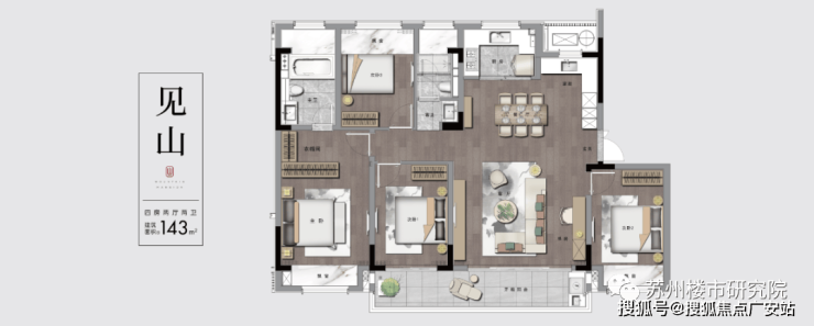 项目建筑风格传承苏式的江南人居特色,饰以典雅灰的立面颜色,街巷相应、园邻相生。以现代手法演绎,汲取苏州园林精粹,构筑“一轴六庭八景”,呈现匍匐在绵延山麓的四季姑苏的居住情景