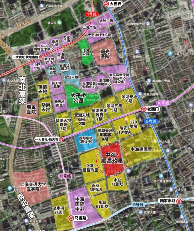 值得一提的是,该板块是真正的上海中心,周边四条地铁线路加持,分别是8号线、9号线、10号线和13号线,共有四个站点,可到达各个区域。
