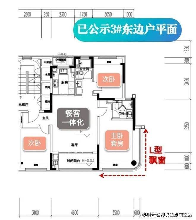 东边户为三房两厅两卫,为园区为数不多的三分房设计,总面宽约11.2m。LDKB一体化设计,阳台4.6m,主卧开间约3.5m,其余卧室开间均在3.05~3.1m左右,整体空间感不错。