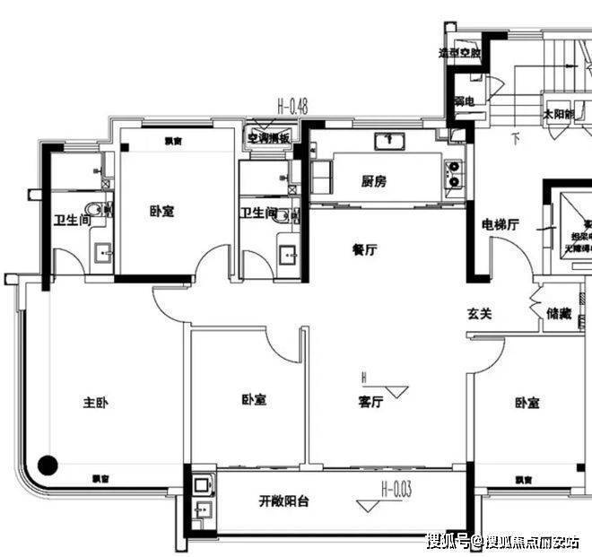 此户型为四开间朝南,客厅为方厅,开间4.2m,DBK一体化动区设计;开放阳台,开间7.2m;主卧套房设计,配备独立卫生间,三个卧室拥有飘窗。