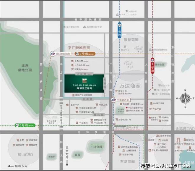 周边交通:璀璨平江所处的平江新城,除了现有的多条快速路,轨交,区域本身也在修建与主干道相连的多条通行道路。自驾可依托西环快速路、春申湖快速路等,快达苏州各城区;地铁出行,可依靠地铁2、4、6(在建)、8(在建),四轨环绕;公交或短距离出行可快速到达平江新城、万达、繁花等商圈。