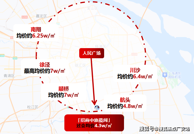 距离人民广场20km左右的嘉定南翔、浦东川沙的均价基本都在6万+/㎡;
