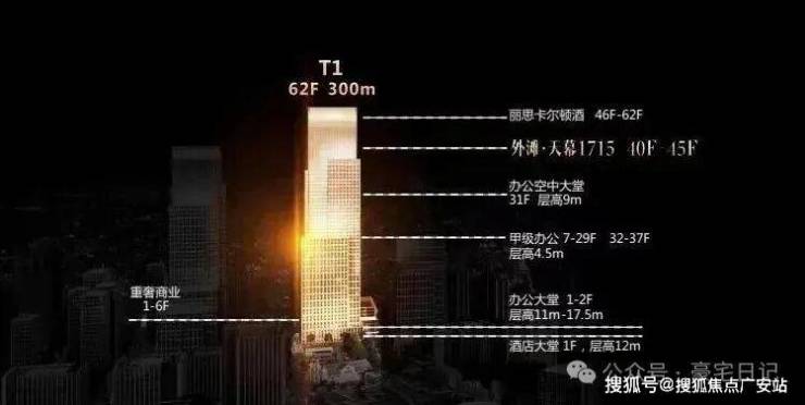 绿地外滩中心项目占地面积约12.67万㎡,总建筑面积约119.9万㎡,地上建筑面积中,计容建筑面积约70.19万㎡,其中商办57.5558万㎡,住宅12.6342万㎡。项目包括4栋甲级写字楼(T1,T3分别为300米+240米)、7栋总部办公楼、购物中心、超高层星级奢华酒店、8栋住宅楼等。其中300米的超高层规划蓝图,在天际建筑汇聚的外滩,再一次刷新了城市天际线,T1-300米超高层上部,46-62层为五星级酒店(丽思卡尔顿)38-40-45层为行政公馆!中部7-37层为甲级办公,底部为商业及大堂。