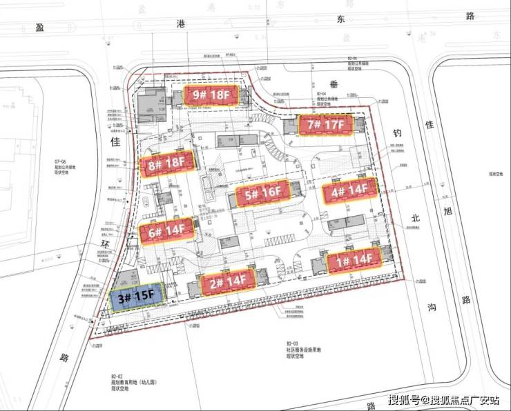 从方案来看,项目多为14-18F的小高层和高层住宅,非人车分流,部分楼栋首层有架空,东面有河道经过,南面规划了一处幼儿园用地(华发代建)。