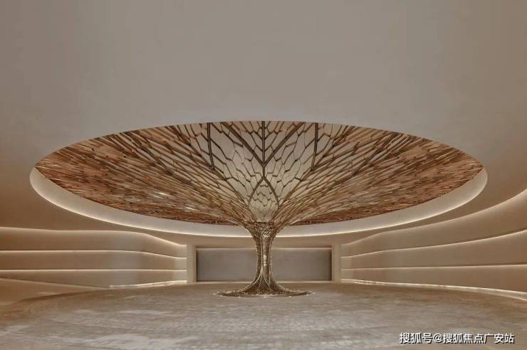 大堂「生机之亭」高约15米,凌空矗立为归家动线的核心枢纽。藤蔓枝干与天花交织缠绕,地面与顶面纹理呼应,共织以森林韵律为魂的生态栖居归家仪式。