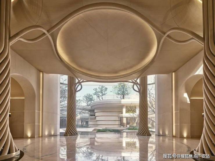 大门内外两重门厅景墙运用月光米黄石材近1000方,搭配香槟金金属线条,汲取爱马仕全球旗舰店的双曲面叠墙造景手法,增加景墙奢华质感。项目沿河的楼幢整体上抬,也就是——抬地式。好处在于地库通风,客户行车归家动线更合理。
