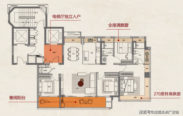 其次,约89.4%的超高实际实得率,得益于新规前对附赠面积的慷慨:约14.7米南向四面宽、附赠约6.64㎡阳台、约12.35㎡飘窗,将光照与空间利用率最大化。