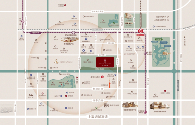 该地块位于南桥核心地段,南侧紧邻浦南运河休闲步道,北侧有S4高速出入口,紧邻地铁5号线环城东路站,1站至望园路站还可换乘15号线(南延伸段在建),进站直达紫竹高新园区和莘庄城市副中心,北侧还有市域南枫线(在建)环城西路站,周边三轨交环绕。