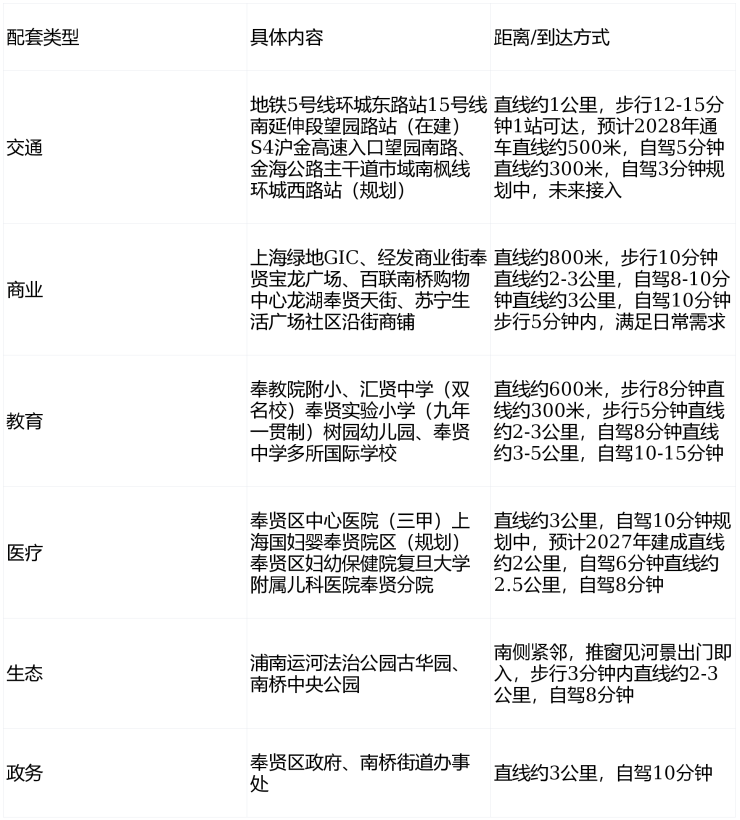 3公里内:奉贤宝龙广场、百联南桥购物中心、龙湖奉贤天街、苏宁生活广场等大型商业综合体,涵盖高端购物、影院娱乐、亲子体验等多元业态