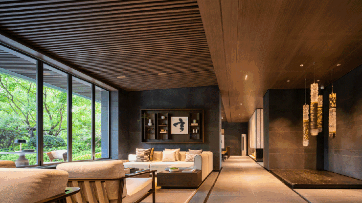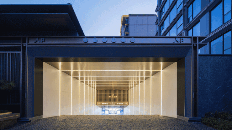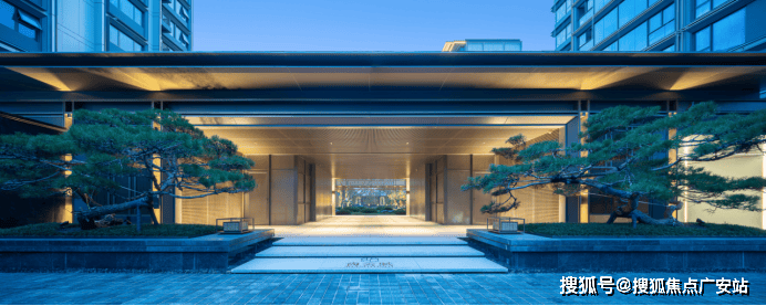 南侧主入口采用重檐门庭、金属格栅、意趣昆石,搭配约 70万珍稀古树,还原宋画深宅大院的威仪。约57米恢弘尺度,媲美南京总统府门庭气度