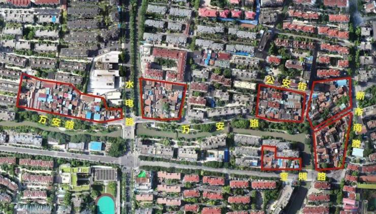 总共7个零散地块,是一个毛地城市更新项目。中间穿插了两条自然河流,一座滨河绿地,多条道路,各自体量都不大,但沿万安路连成一线。