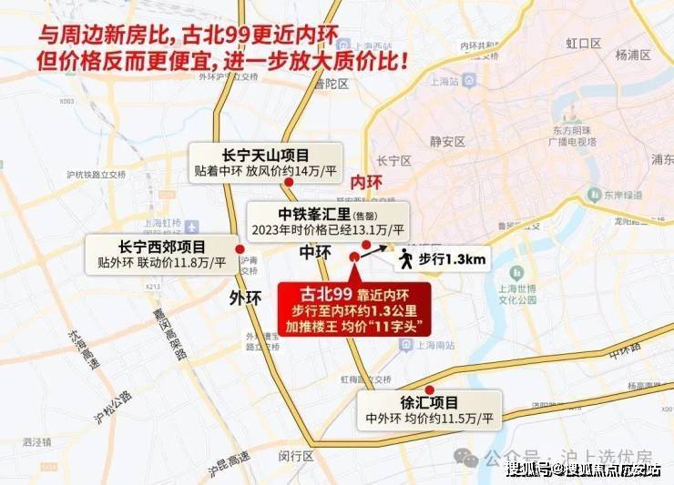 其次,古北99步行到内环只有约1.3公里,均价“11”字头,而长宁天山项目贴着中环,预计14万/㎡;长宁西郊项目贴着外环,联动价11.8万/㎡.