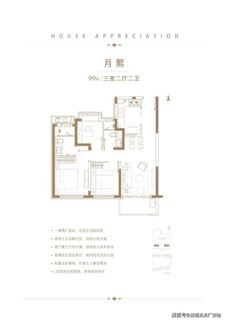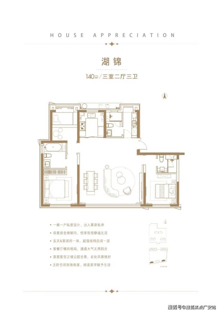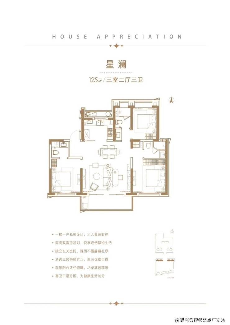 建面约125㎡3房2厅3卫,做到了3开间朝南+双套房设计+南北通透,一步到位的大3房户型。