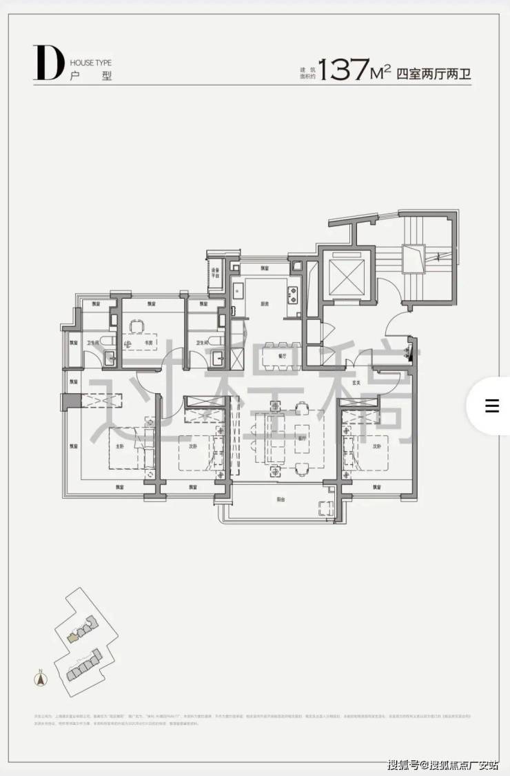 137㎡四房:6.6米面宽横厅+270°转角飘窗,全屋8个飘窗(含2个转角窗),主卧飘窗面积超4㎡,标配入户玄关、家政间、双台盆主卫