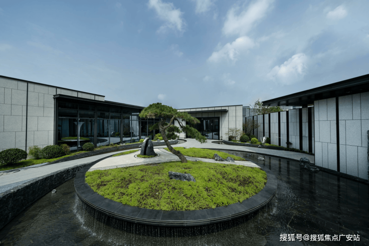以内敛低调的高级灰作为主色调,结合中庭岛式水景和黑松景观,建筑、小品和草木相互映衬,一光一影,别具风韵。