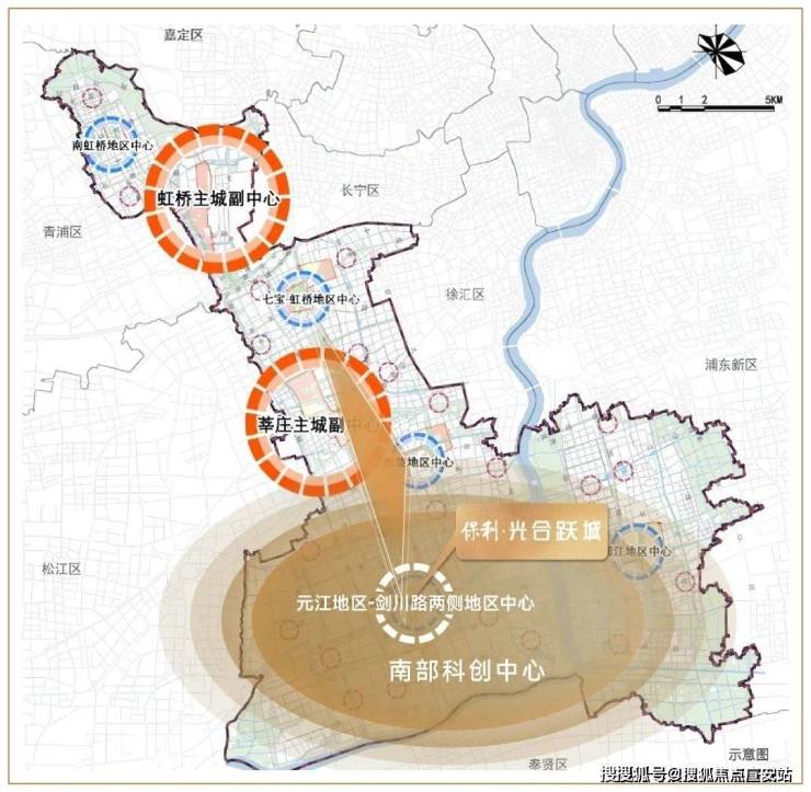 作为上海全球城市五大主城片区之一,闵行主城以其南部单元担当上海南部科创中心核心区,与虹桥同频,形成南北联动发展格局,成为上海版图中心“金钥匙”。元江路-剑川路地区中心是闵行五大中心之一,能级比肩漕河泾、张江,与梅陇、七宝共筑闵行TOD金三角。