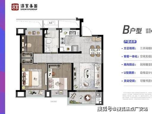 建面约99㎡的三房两厅两卫,很适合一家三口的上车的作品。三开间朝南,南北通透,动静分区,