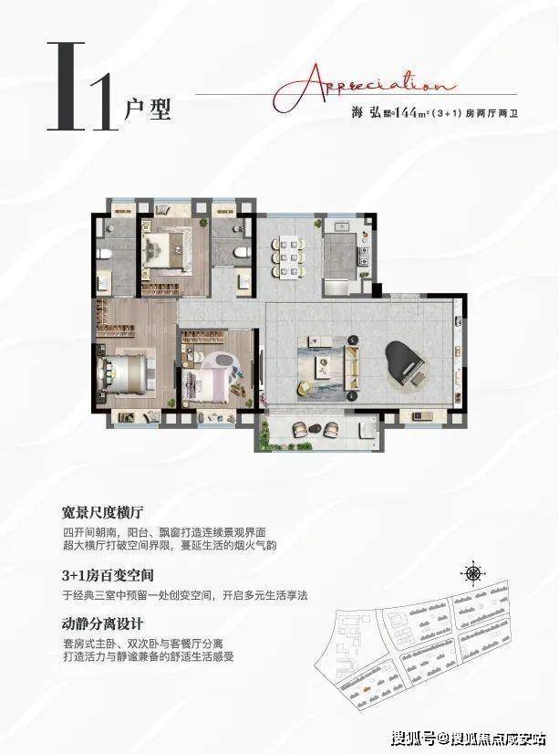 户型解析:宽景尺度横厅,四开间朝南,阳台、飘窗打造连续景观界面,超大横厅打破空间界限,蔓延生活的烟火气韵;3+1房百变空间,于经典三室中预留一处创变空间,开启多元生活享法;动静分离设计,套房式主卧、双次卧与客餐厅分离,打造活力与静谧兼备的舒适生活感受。