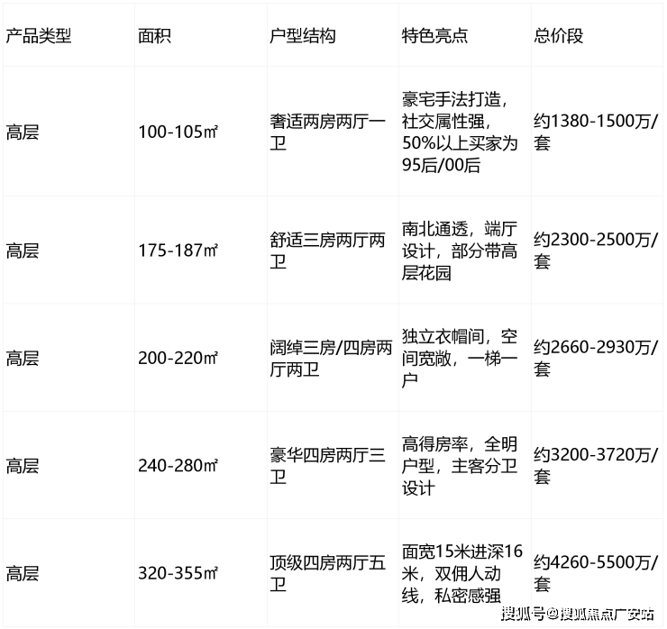 产品线丰富:100-355㎡全尺度覆盖,从奢适两房到顶级四房,总价 1380-5500 万 / 套